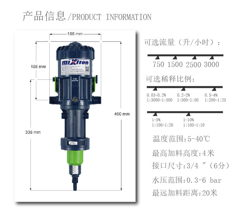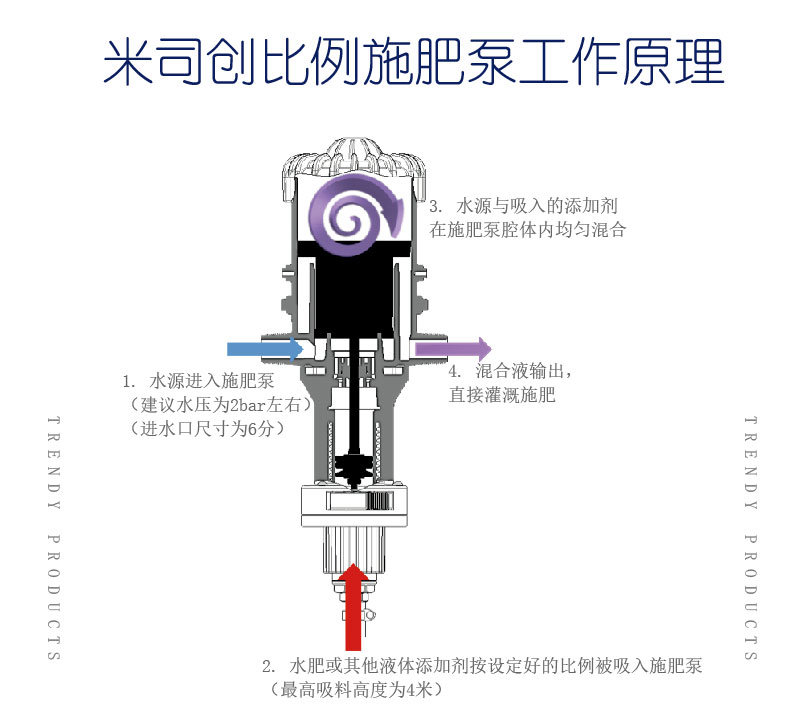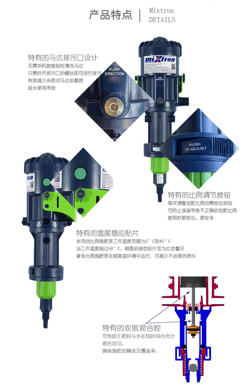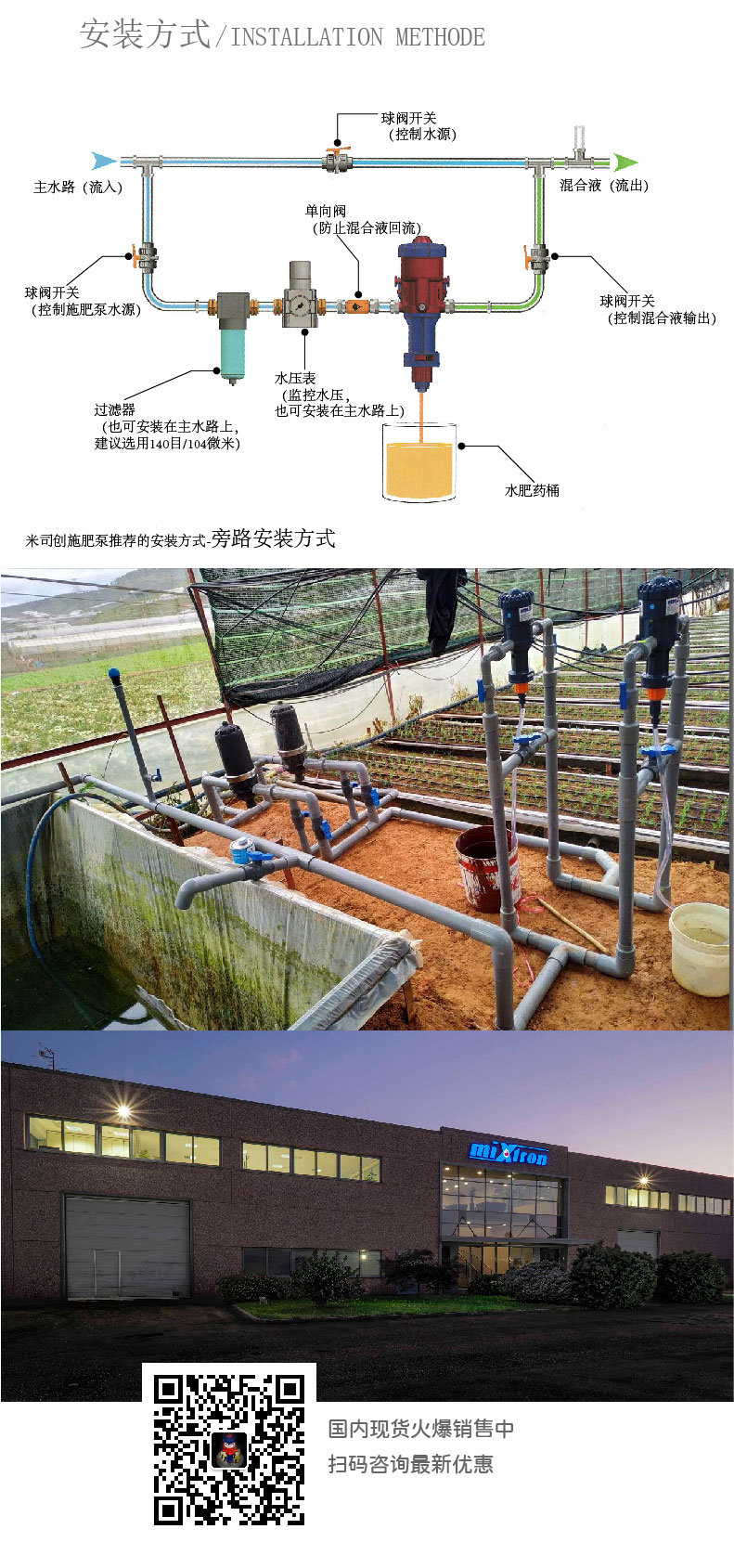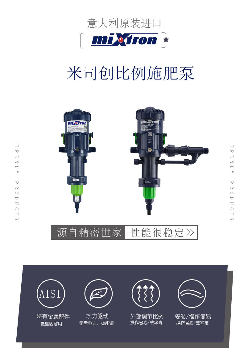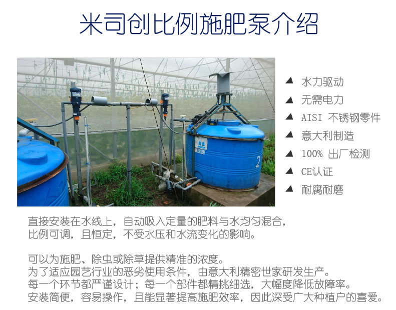 比例施肥泵又称比例式注肥泵,施肥器,自动比例泵等。为大棚蔬菜、园林花卉等恒定、均匀、成比例的注入肥料。应用灵活性强。是水肥一体化的好帮手。